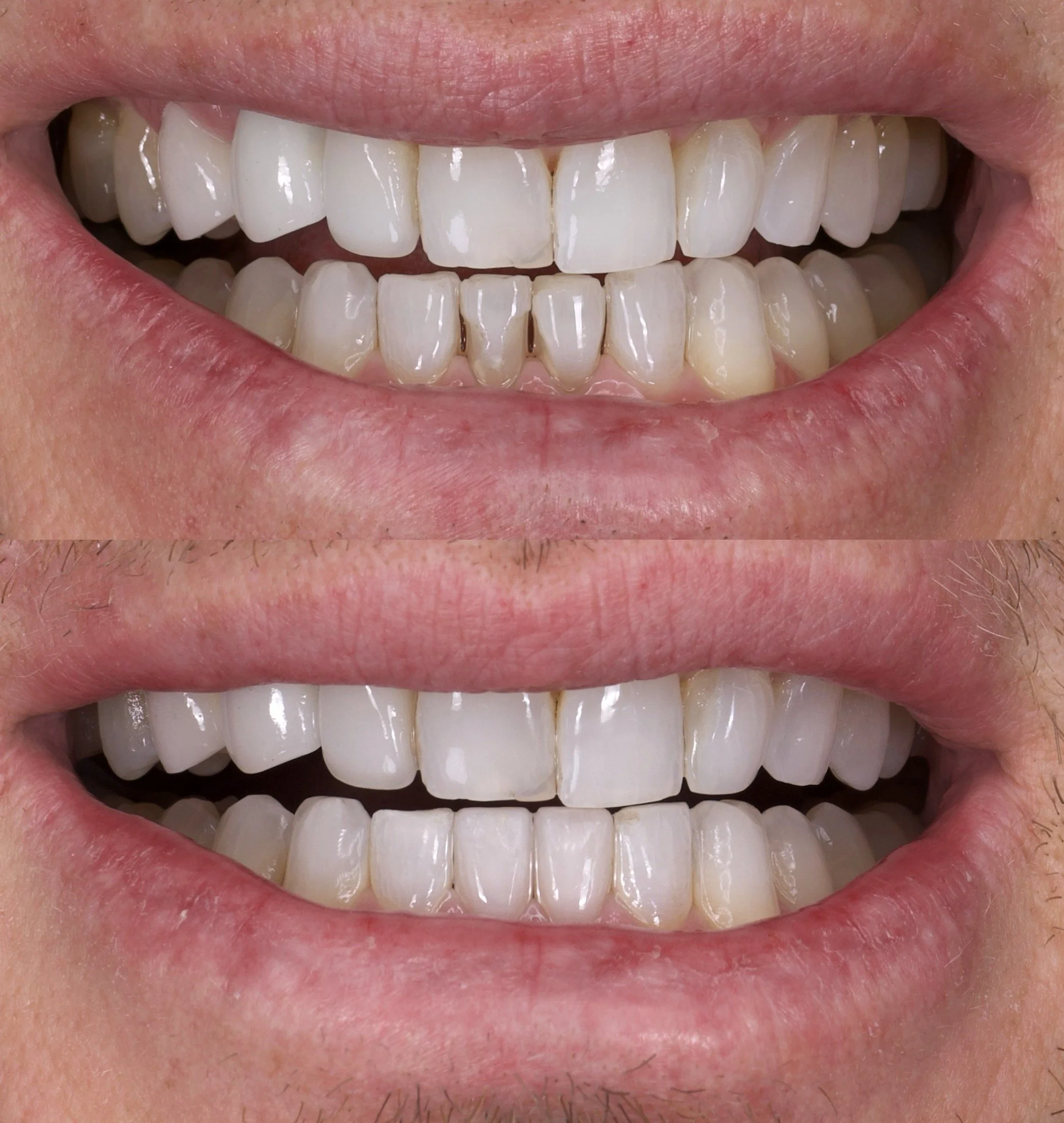 2 Layered eMax Crowns in Shade OM1 to D2. Diagnostic waxup with patient-approved temporaries for shape and shade. Medium translucency and natural aesthetics. Photo shown is day of bonding: gum tissues will look perfect in a few days. Light staining.